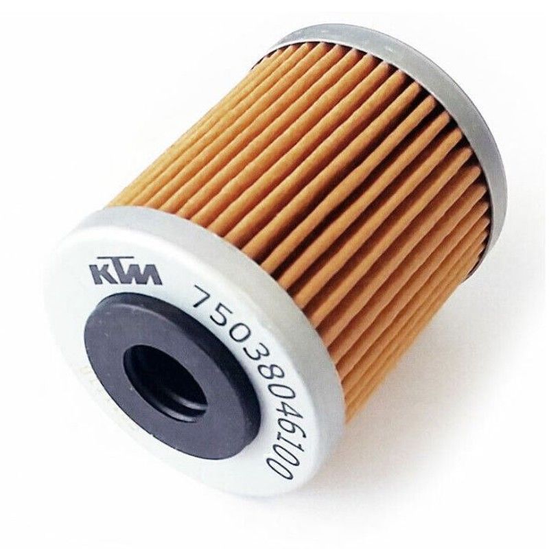 Filtro cilíndrico con carcasa de plástico blanco y grisElemento filtrante de fibra naranja con surcos verticalesTapón central negro con roscaMarca ktm impresa en la baseNúmero de referencia 75038046100 visible
