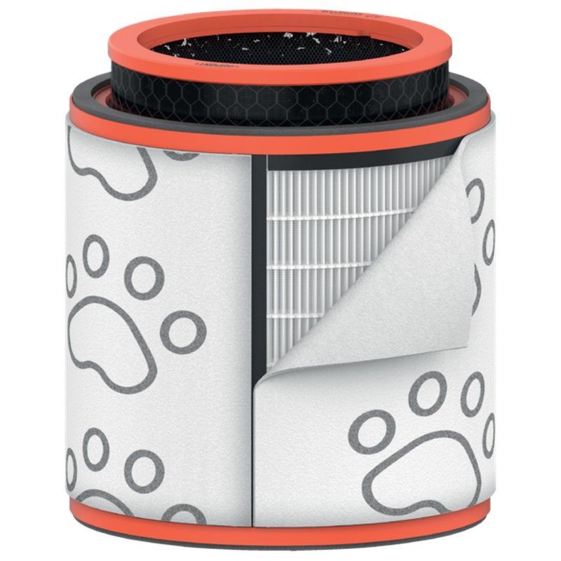 Filtro cilíndrico con diseño de huellas de mascota en gris sobre fondo blancoBorde superior e inferior de color naranjaInterior con estructura de rejilla metálica visibleCapa de material negro en la parte superior, posiblemente carbón activado