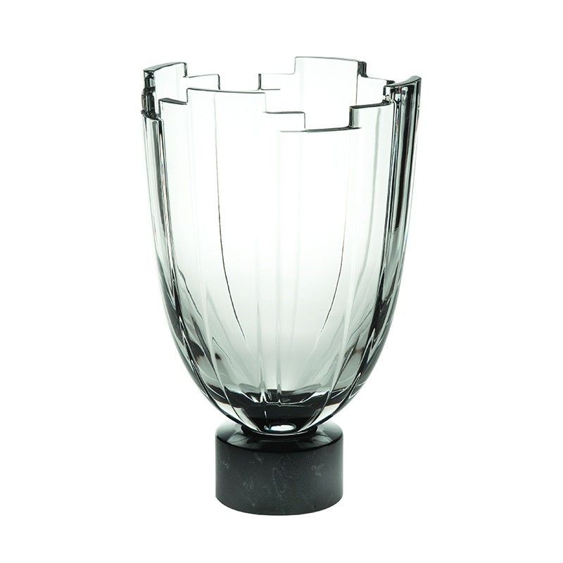 Florero decorativo Odeon de cristal transparente con base negra, ideal para espacios modernos. Con dimensiones de 21,5 cm de diámetro y 33,3 cm de altura, su diseño facetado y bordes escalonados aportan un toque sofisticado a cualquier mesa o estantería. Perfecto para flores secas o como pieza decorativa independiente.