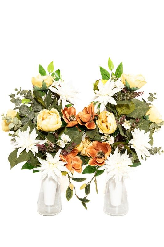 Ramo de flores artificiales compuesto por magnolias blancas, rosas amarillas y flores naranjas, acompañadas de hojas verdes y follaje decorativo, dispuestas en dos jarrones de vidrio transparente
