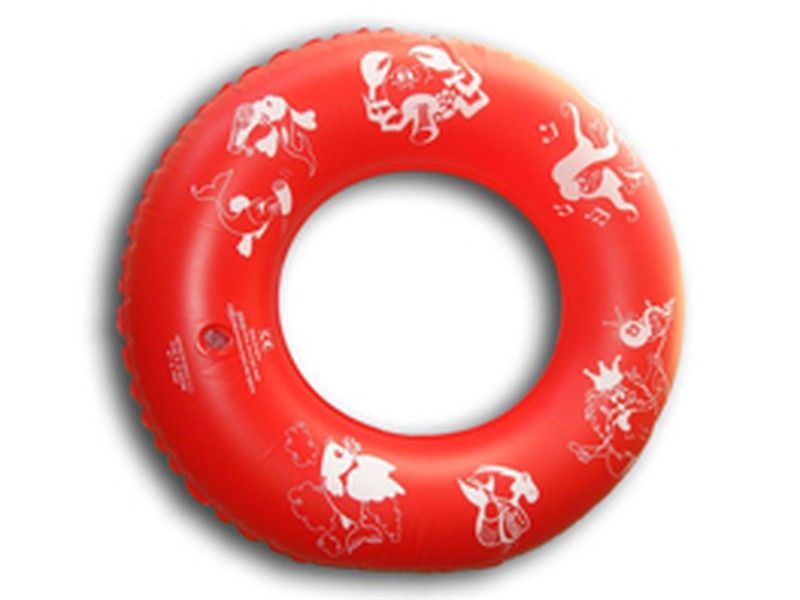 Flotador inflable de 60 cm en color rojo con estampado de personajes blancos, ideal para niños en piscinas o playas. Fabricado en goma resistente y seguro para el uso en agua. Perfecto para divertirse en verano con estilo y comodidad.