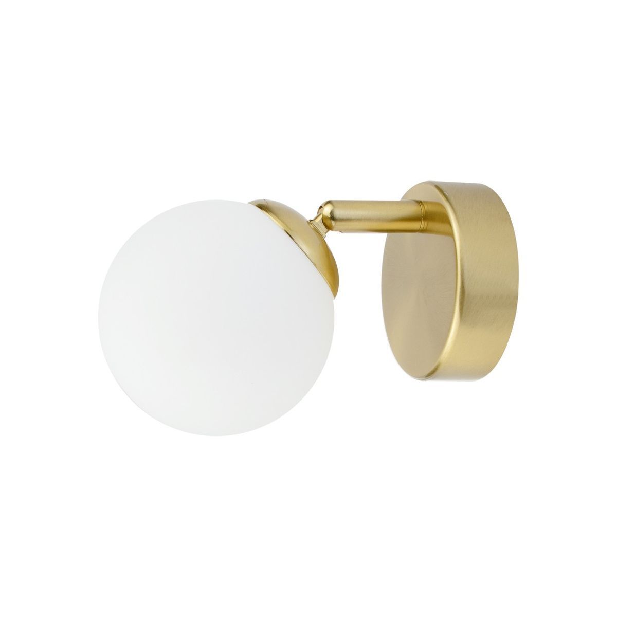 Foco de pared Migos Cuero Tulipa Opal con diseño elegante y moderno, ideal para iluminar espacios como pasillos, baños o dormitorios. Fabricado con estructura metálica en acabado dorado y difusor esférico de vidrio opalino blanco que proporciona una luz suave y cálida. Perfecto para crear ambientes sofisticados y acogedores en tu hogar.