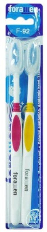 Pack de dos cepillos de dientes Foramen Clinic92 Suave, ideales para una higiene bucal diaria efectiva. Con cabezas redondas y cerdas suaves, ofrecen comodidad y protección para encías sensibles. Empaquetados en blister transparente, con manijas blancas y detalles en rosa y amarillo para fácil identificación. Perfectos para uso diario en casa o via