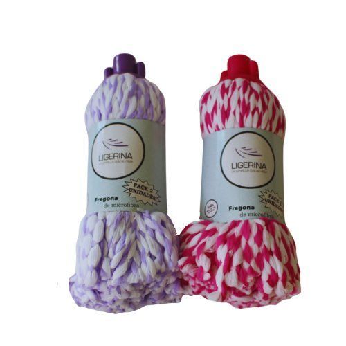 Fregona de microfibra Ligerina en pack de 2 unidades, ideal para limpiar suelos con eficacia y suavidad. Con diseño geométrico en tonos morado y rosa sobre fondo blanco, estas fregonas son resistentes, absorbentes y fáciles de lavar. Perfectas para uso diario en hogar y cocina.