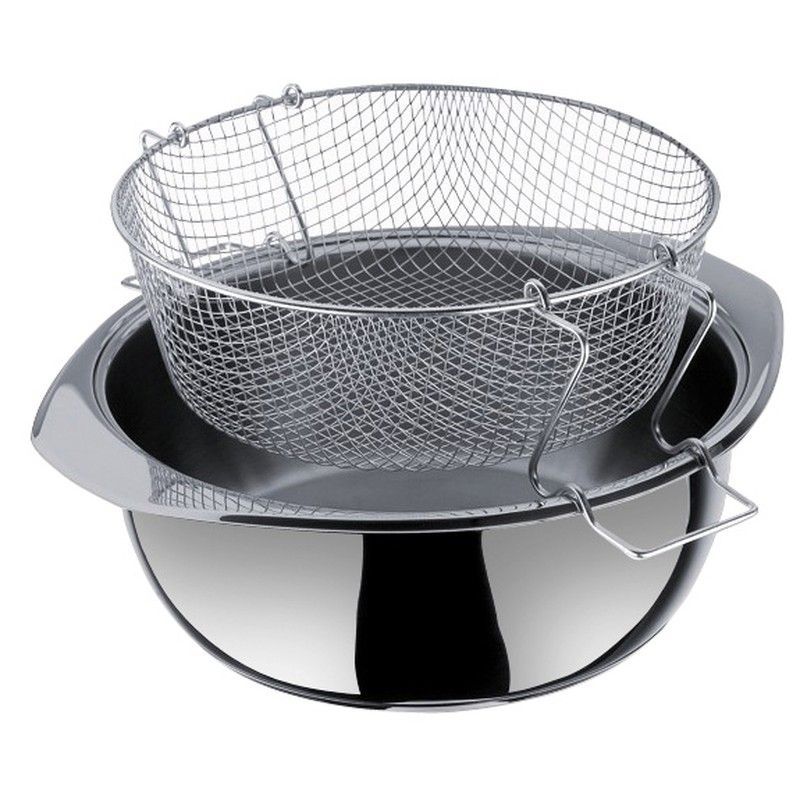 Freidora con cestillo y fondo difusor de 24 cm, fabricada en acero inoxidable de alta calidad. Ideal para freír alimentos de forma uniforme y segura, con fácil manejo gracias a sus asas. Perfecta para cocinar en casa y obtener resultados profesionales. Incluye cestillo de malla fina para una cocción óptima.
