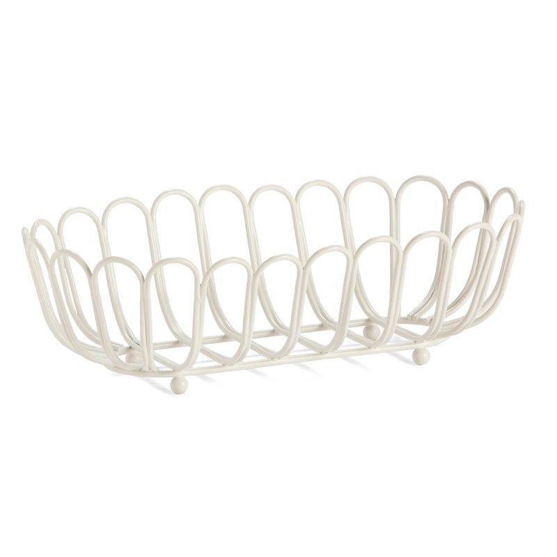Frutero de metal blanco con diseño elegante y moderno, ideal para servir frutas, pan o dulces en la mesa. Su estructura de arcos interconectados y forma ovalada aporta un toque decorativo a cualquier cocina o comedor. Fabricado en metal resistente, es fácil de limpiar y perfecto para uso diario en hogares o restaurantes.