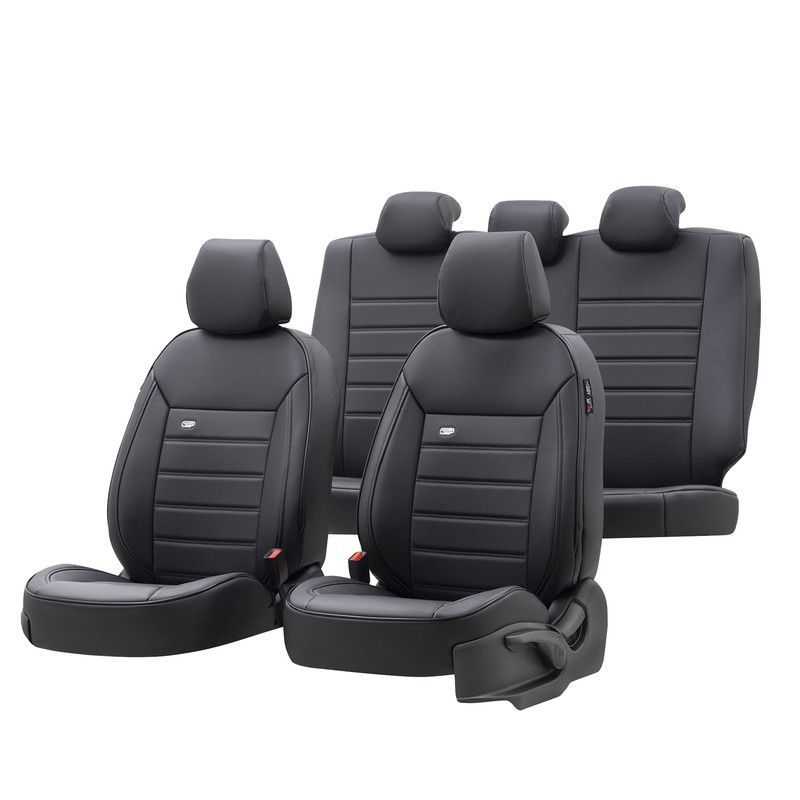 Funda completa universal para asientos de coche en polipiel premium de color negro. Diseño elegante con costuras verticales que aportan estilo y comodidad. Ideal para proteger los asientos originales de tu vehículo, fácil de instalar y adecuada para adultos. Incluye fundas para reposacabezas y laterales con cierres para un ajuste seguro.