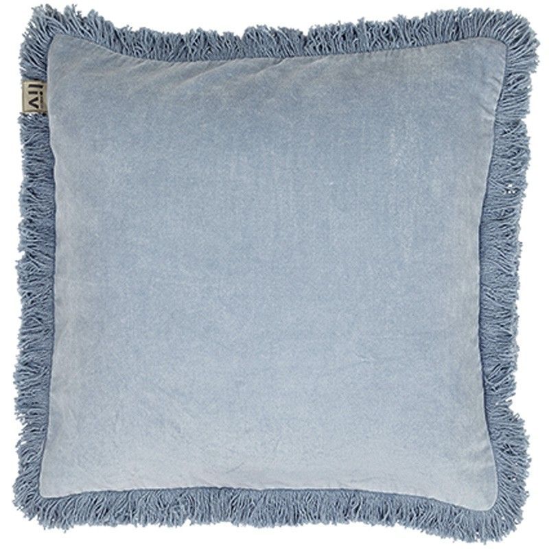 Funda de cojín de terciopelo en color azul hielo, con elegantes flecos en los bordes. Ideal para decorar sofás, camas o sillones, aportando un toque de lujo y confort. Hecha en terciopelo de alta calidad, su textura suave y acabado sofisticado la convierten en un accesorio perfecto para cualquier ambiente. Medidas: 45 x 45 cm.