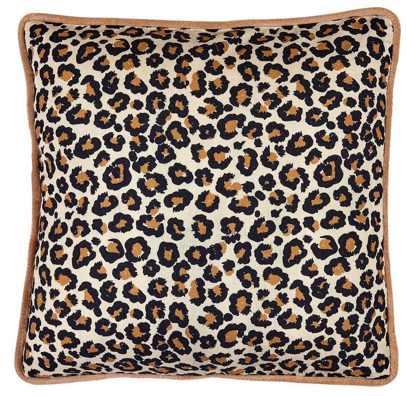 Funda de cojín de 45 x 45 cm con estampado animal print en tonos bronce, negro y blanco. Fabricada en terciopelo y algodón orgánico, ideal para decorar sofás, camas o sillones. Aporta un toque sofisticado y natural a tu hogar con su diseño de leopardo y acabado premium.
