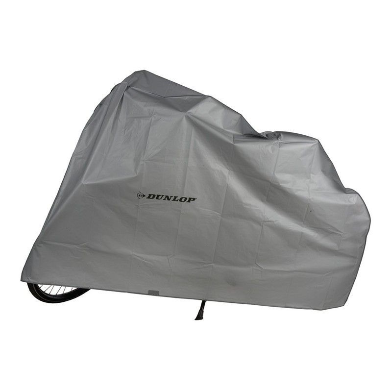 Funda protectora para bicicleta de 210x110 cm, fabricada en poliéster resistente al agua y a los rayos UV. Ideal para proteger tu bicicleta de la lluvia, polvo y suciedad. Con logo 'DUNLOP' y cierre con correa para un ajuste seguro. Perfecta para uso en exteriores o en garaje.