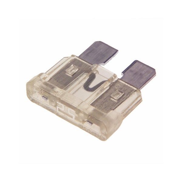 Fusible universal de 25 amperios, ideal para sistemas eléctricos de vehículos motorizados. Con carcasa transparente y contactos metálicos resistentes, ofrece protección confiable contra sobrecargas. Fácil instalación en cajas de fusibles estándar. Calidad duradera para uso en automóviles, motocicletas y equipos eléctricos de vehículos.
