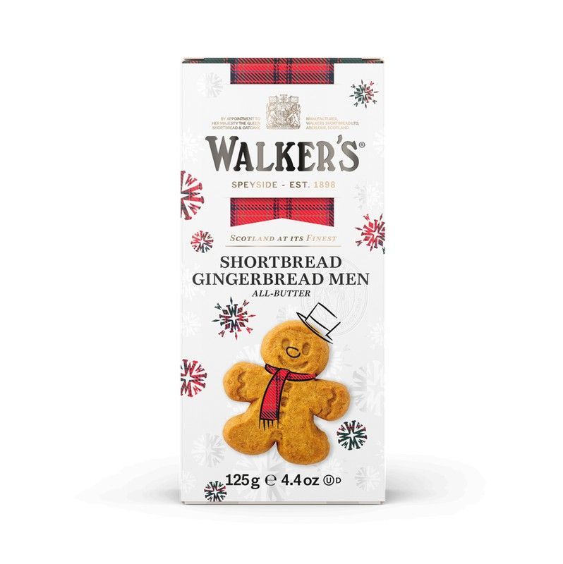 Galletas de mantequilla navideñas Walkers Gingerbread Men, elaboradas con mantequilla 100% y con forma de hombres de jengibre. Embalaje festivo con diseño escocés y detalles navideños. Perfectas para compartir en temporada de fiestas o como regalo gourmet. Peso neto: 125 gramos.