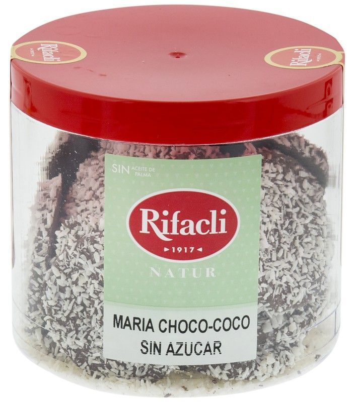 Galletas María Choco-Coco sin azúcar de Rifacli, en práctico envase transparente con tapa roja. Ideales para disfrutar sin culpa, con un delicioso sabor a chocolate y coco. Perfectas para momentos de snack saludable o como regalo. Sin azúcar añadida, con textura crujiente y cubierta de coco rallado.