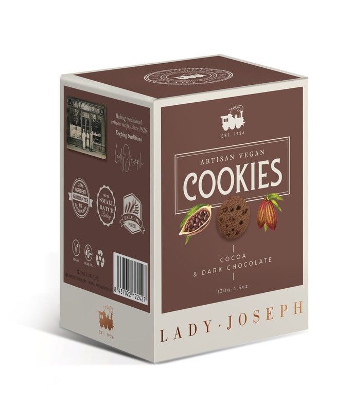 Galletas veganas de cacao y chocolate negro Lady Joseph, elaboradas artesanalmente desde 1926. En una elegante caja de cartón con diseño sofisticado, estas galletas son ideales para amantes de productos naturales y sin ingredientes animales. Perfectas para disfrutar como snack saludable o regalo gourmet. Peso neto: 130 gramos.
