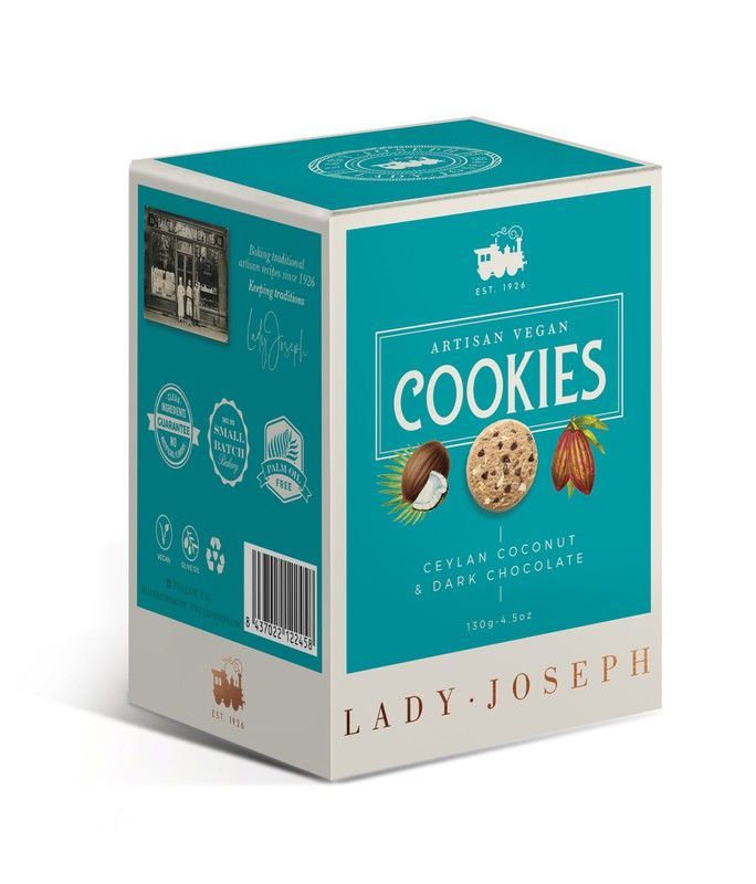 Galletas veganas de coco y chocolate negro de Lady Joseph, elaboradas artesanalmente desde 1926. En caja de cartón con diseño elegante y detalles dorados, ideales para disfrutar como snack saludable y gourmet. Sin gluten, sin lácteos y con ingredientes naturales. Perfectas para amantes de la repostería vegana y con un toque exquisito de coco y choc