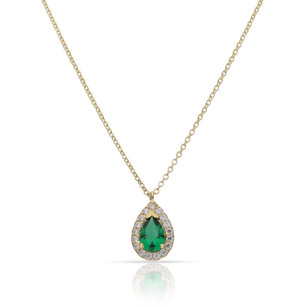 Gargantilla de mujer en oro 18k con elegante colgante en forma de gota, destacando una piedra central de crisopas verde tallada con precisión y rodeada de circonitas brillantes. Ideal para mujeres que buscan un toque de sofisticación y elegancia en sus looks. Perfecta para ocasiones especiales o como regalo exclusivo.