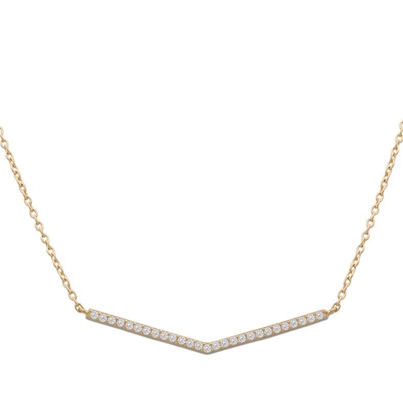 Gargantilla para mujer en oro de 18 kilates con diseño en forma de V y acabado en pico, adornada con circonitas en pave. Elegante y sofisticada, ideal para looks formales o diarios. Su cadena fina y brillo discreto la convierten en un accesorio versátil y de alta calidad para cualquier ocasión.