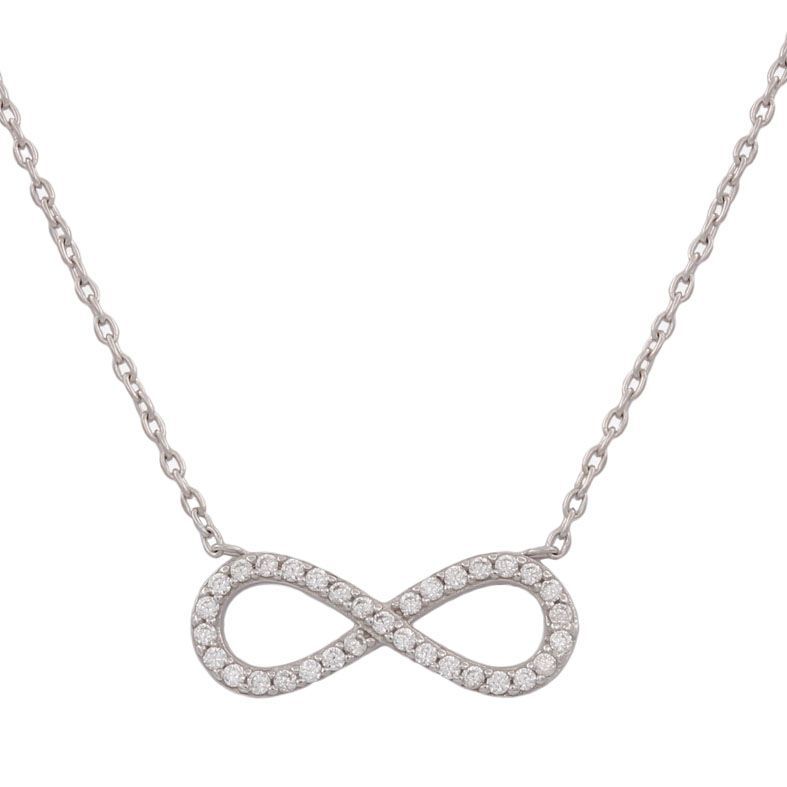 Elegante gargantilla en oro blanco 18K con diseño de infinito, adornada con circonitas que brillan con cada movimiento. Ideal para mujeres que buscan un toque sofisticado y atemporal. Perfecta para ocasiones especiales o como joya diaria de estilo minimalista. Cadena fina y ajustable para un ajuste cómodo.