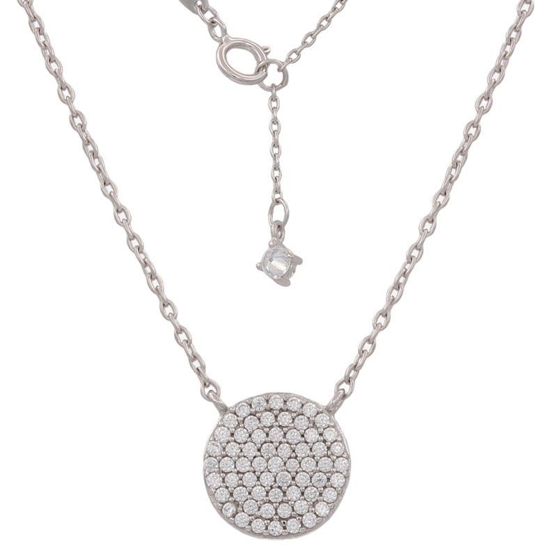 Elegante gargantilla en oro blanco de 18K con colgante circular pavé de circonitas, ideal para mujeres que buscan un toque sofisticado y brillante. Diseño minimalista y versátil, perfecto para combinar con cualquier atuendo, desde looks formales hasta diarios. Cadena fina con cierre seguro y detalle adicional de dije en forma de diamante. Joya de a