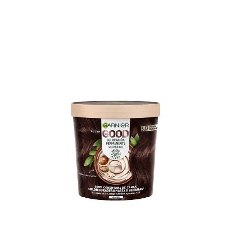 Tinte permanente Garnier Good en tono 3.12 Castaño Arandano, ideal para cubrir canas con hasta 100% de cobertura y mantener el color hasta 8 semanas. Fórmula enriquecida con ingredientes naturales, sin amoníaco, para un cabello saludable y con brillo. Perfecto para quienes buscan un color intenso y duradero con cuidado capilar.