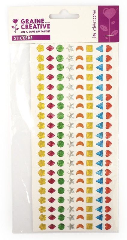 Pegatinas adhesivas en forma de gemas epoxi, ideales para decorar álbumes, tarjetas, scrapbook y proyectos creativos. Con diseños brillantes en formas de estrellas, corazones, lunas y gemas en colores vivos como amarillo, rojo, verde, azul y plateado. Perfectas para manualidades infantiles y adultos. Contiene 320 unidades en blister transparente.