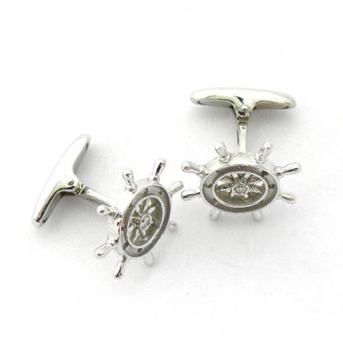 Elegantes gemelos en oro blanco de 18 quilates con diseño de timón de barco, incrustados con brillantes. Perfectos para hombres que buscan un toque náutico y sofisticado en su vestimenta formal. Ideal para ocasiones especiales, bodas o eventos de negocios. Calidad premium y acabado impecable.
