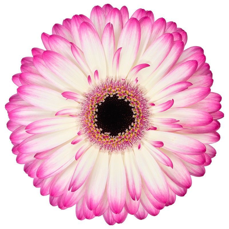 Gerbera Mandala, una flor de corte con pétalos en tonos blancos y rosas intensos que se gradúan hacia los bordes, y un centro oscuro con detalles morados y amarillos. Ideal para arreglos florales, decoración de eventos o como regalo. Su belleza natural y simetría la convierten en una opción elegante para cualquier ocasión.