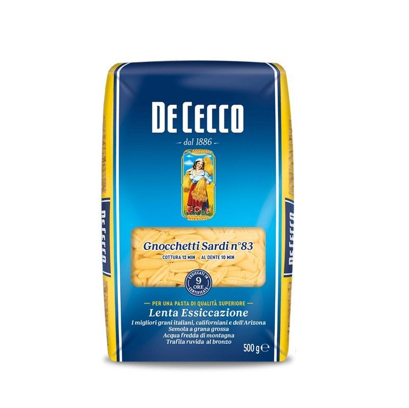 Gnocchetti Sardi n°83 de De Cecco, pasta italiana de calidad superior elaborada con trigo duro italiano y agua de montaña. Secado lento para una textura perfecta y sabor auténtico. Ideal para cocinar en 10 minutos y disfrutar en platos tradicionales o creativos. Paquete de 500 g.