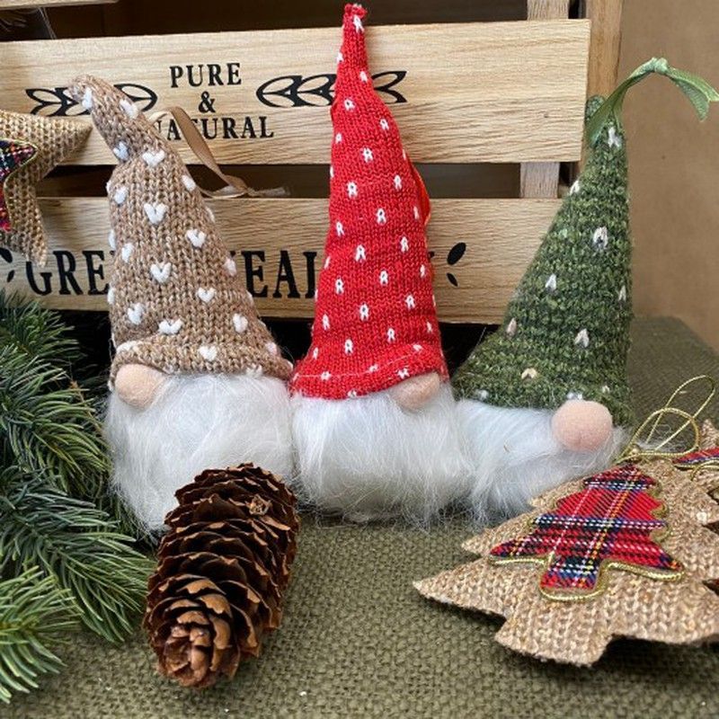 Conjunto de 3 gnomos navideños con gorros tejidos en verde, rojo y marrón con lunares blancos, barbas de algodón y narices rosadas. Ideales para decorar tu hogar en Navidad, con acabados en lana y detalles en plástico. Perfectos para estanterías, mesas o como regalo festivo. Tamaño compacto: 6 x 6 x 20 cm.
