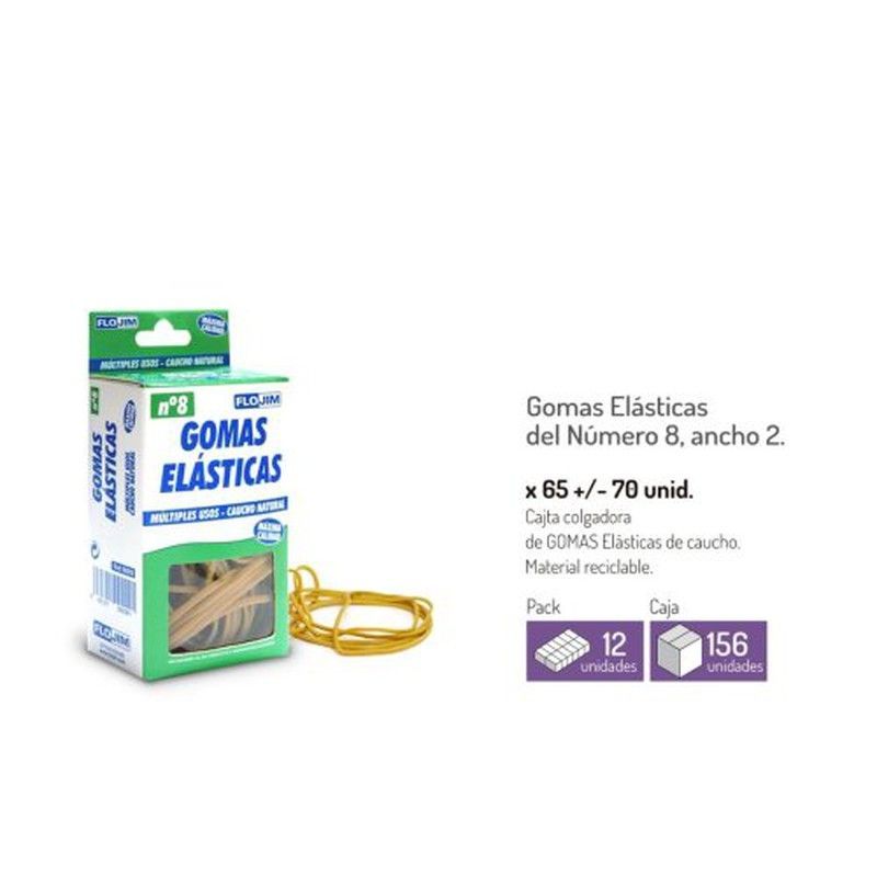 Caja colgadora de gomas elásticas número 8, ancho 2, ideal para uso diario en oficina, escuela o hogar. Contiene entre 65 y 70 unidades por pack, con material reciclable y diseño práctico. Perfectas para sujetar documentos, bolsas o pequeños objetos. Calidad duradera y resistente.