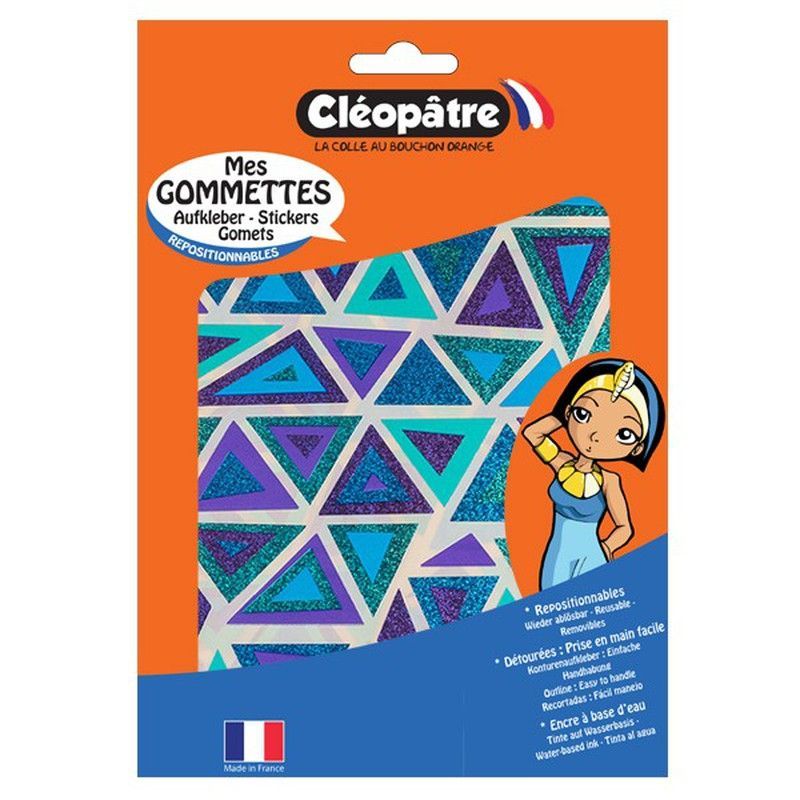 Gomets geométricas repositionables con diseño de triángulos en tonos azules y morados, algunas con acabado holográfico. Ideales para manualidades infantiles, decoración de cuadernos y proyectos creativos. Fáciles de manejar y con tinta a base de agua. Fabricadas en Francia, perfectas para niños que disfrutan de actividades artísticas.