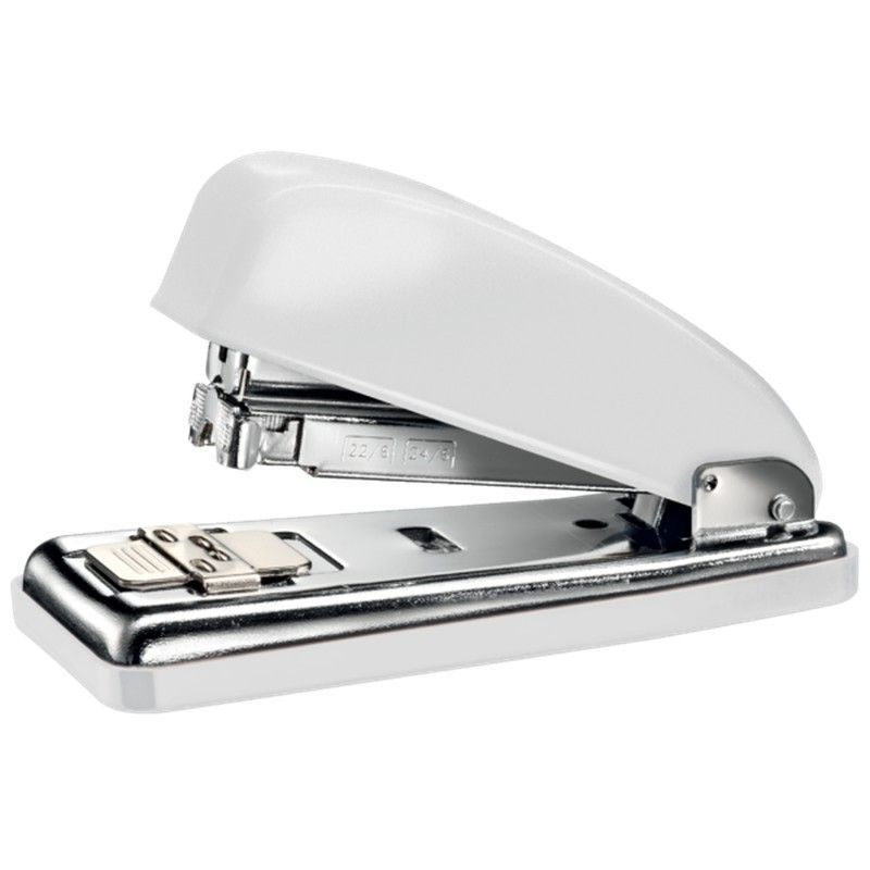 Grapadora Petrus mod. 226 WOW en color blanco metalizado, ideal para oficinas y uso diario. Fabricada en metal y plástico de alta calidad, ofrece un diseño moderno y funcional con acabado cromado. Perfecta para grapar documentos con facilidad y precisión. Incluye mecanismo de carga visible y base estable para un uso cómodo y seguro.