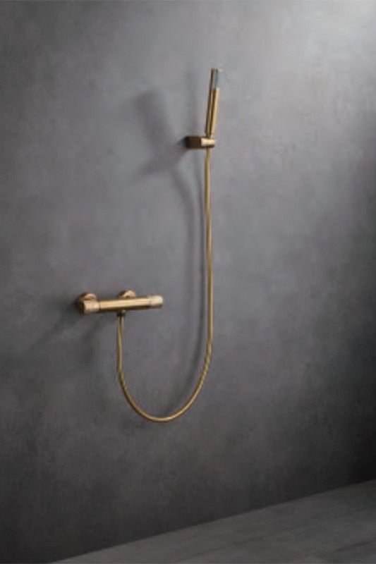 Grifería de ducha termostática Line Oro Cepillado BTD038-5OC de Imex, con acabado dorado cepillado y diseño minimalista. Ideal para baños modernos y elegantes, fabricada en metal de alta calidad. Ofrece control preciso de temperatura y un aspecto sofisticado que combina perfectamente con paredes de cemento o superficies neutras. Instalación en pare