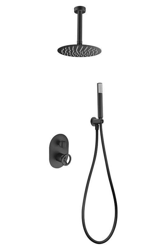 Grifo empotrado de ducha con acabado negro mateLlave de control circular con mango giratorioCabezal de ducha redondo con múltiples salidas de aguaManguera flexible negra con boquilla de manoDiseño minimalista y moderno