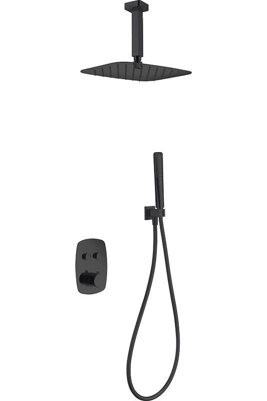 Grifo empotrado de ducha Feroe en acabado negro mate, ideal para baños modernos y minimalistas. Fabricado en acero inoxidable de alta calidad, incluye llave de control empotrada, ducha de techo cuadrada y ducha manual con manguera. Diseño elegante y funcional para una experiencia de ducha sofisticada.