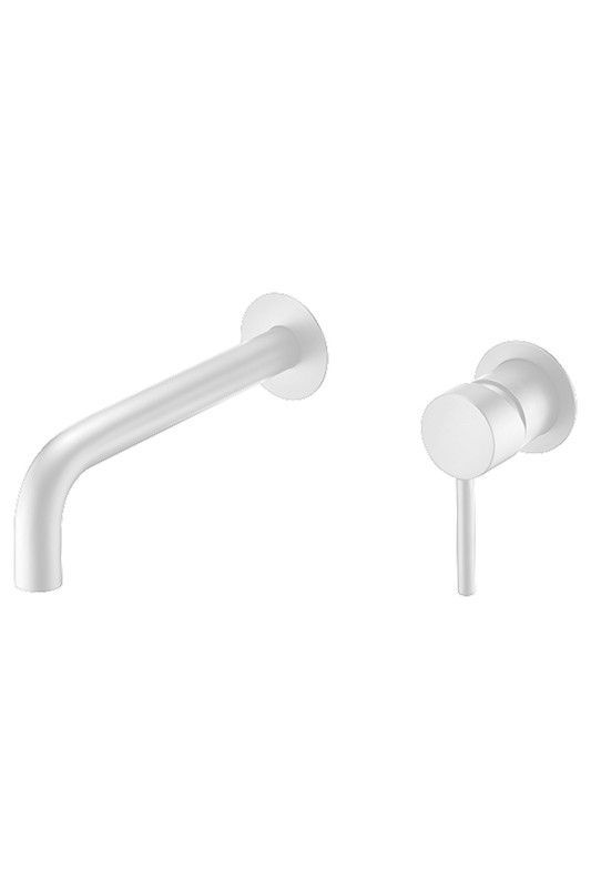 Grifo lavabo empotrado con diseño minimalista, cuerpo curvo y maneta cilíndrica, acabado mate blanco, montaje en pared