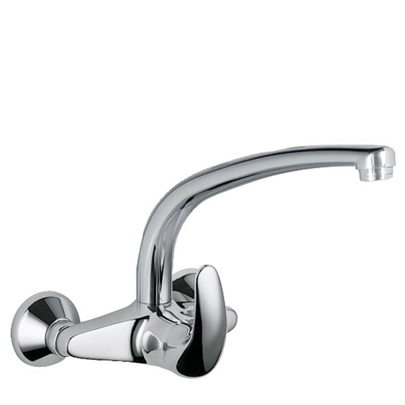 Grifo monomando mural para cocina con acabado cromado brillante y diseño elegante. Fabricado en acero inoxidable de alta calidad, ofrece un flujo de agua controlado con solo un mango. Ideal para cocinas modernas y espacios con estilo minimalista. Fácil instalación en pared y resistente al óxido.