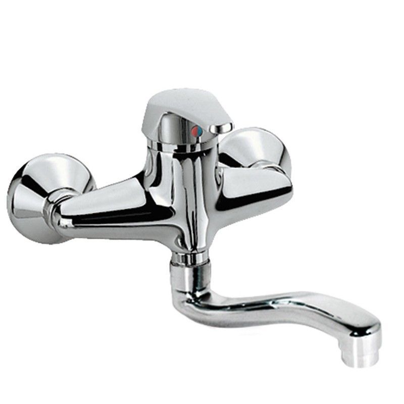 Grifo monomando mural para cocina con acabado cromado brillante, fabricado en acero inoxidable de alta calidad. Diseño moderno y funcional con mango cónico y boquilla curva para un uso cómodo y eficiente. Ideal para cocinas con instalación mural, ofrece control preciso del flujo y temperatura del agua. Resistente a la corrosión y fácil de limpiar.