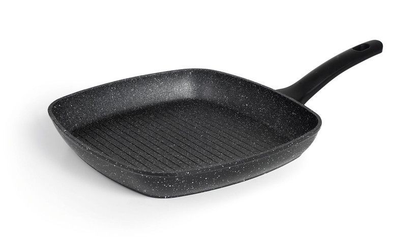 Sartén grill Lacor Piedra Java de 28x28 cm, ideal para cocinar a la parrilla en casa. Con superficie antiadherente y textura de piedra, ofrece una cocción uniforme y fácil limpieza. Fabricada en acero inoxidable y cerámica, resistente al calor y adecuada para todos los tipos de cocinas. Perfecta para preparar carnes, pescados y vegetales con un toq