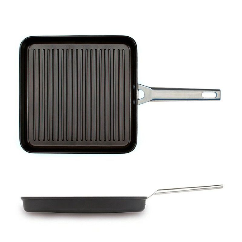 Sartén grill Valira de 28x28 cm con superficie antiadherente y rejilla para cocinar a la parrilla. Fabricada en acero inoxidable y cerámica, ideal para uso en vitrocerámica e inducción. Perfecta para preparar carnes, pescados y verduras con un toque de grill. Diseño elegante y fácil de limpiar.