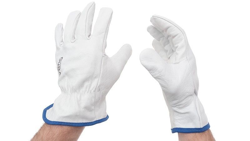Guante de trabajo de piel flor vacuno gris natural, talla 9 L, ideal para profesionales que necesitan protección y agarre en tareas manuales. Confeccionado en piel de alta calidad, ofrece resistencia y comodidad. El puño elástico con ribete azul asegura un ajuste seguro. Perfecto para trabajos en construcción, mecánica o industria.