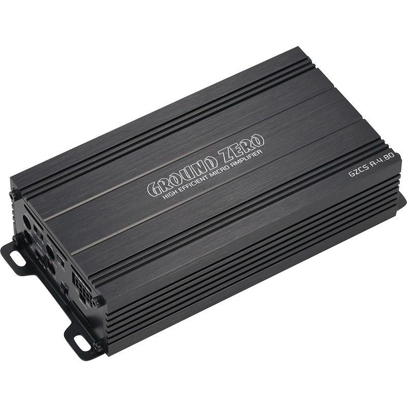 Microamplificador Clase D de 4 canales GZCS A-4.80 de Ground Zero, con 4 x 80W RMS. Diseño ultra compacto y robusto en metal negro, ideal para sistemas de audio en vehículos. Ofrece alta eficiencia y potencia en un formato reducido, perfecto para instalaciones donde el espacio es limitado. Ideal para entusiastas del audio automotriz que buscan cali