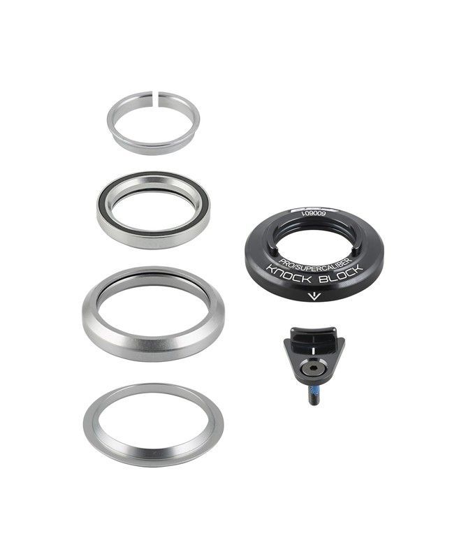 Kit de headset para bicicleta con sistema Knock Block de 62 grados, diseñado para una instalación precisa y ajuste seguro. Incluye anillos de acero inoxidable pulido y componente negro con tornillo azul para mayor estabilidad. Ideal para ciclistas que buscan rendimiento y calidad en sus componentes de dirección. Compatible con sistemas de bicicleta
