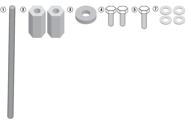 Kit de herraje de defensa motor Givi TN5108KIT para BMW R 1200 R/RS/GS (2013-2018). Fabricado en acero inoxidable de alta calidad, incluye perno, soportes, tornillos y arandelas para una instalación segura y duradera del portaequipajes. Ideal para motociclistas que buscan una solución robusta y resistente al óxido.