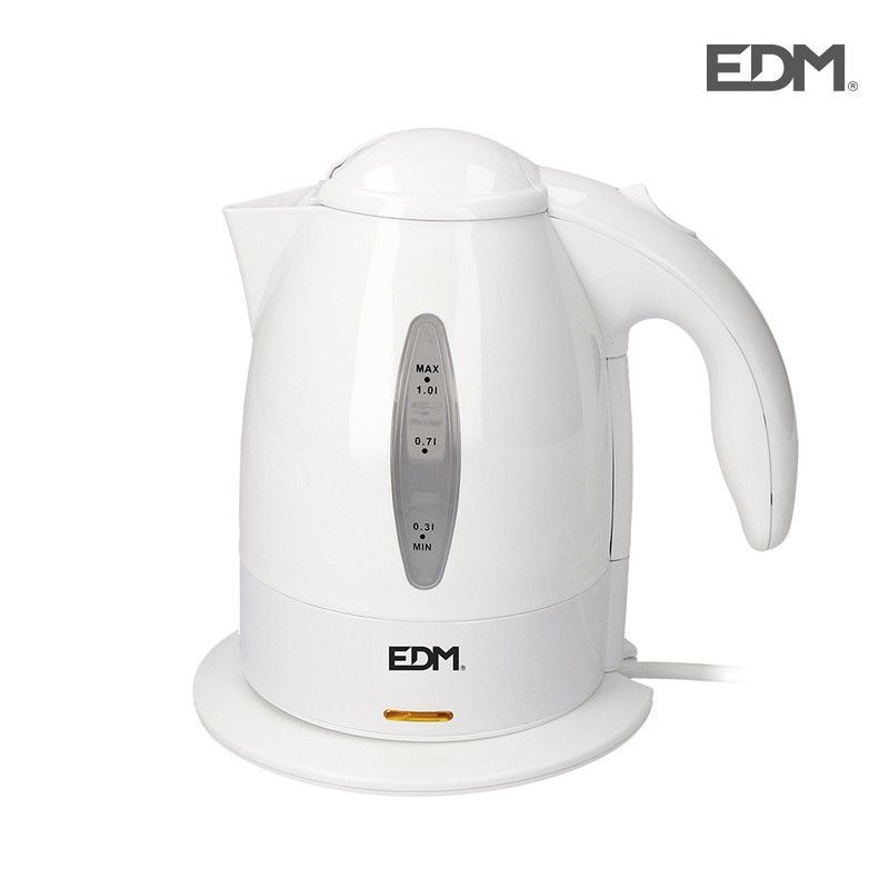 Hervidor eléctrico EDM de 2200W y 1 litro, ideal para preparar agua caliente rápidamente en casa o en la oficina. Diseño moderno y compacto en color blanco, con panel de medición de nivel de agua y base con indicador de encendido. Fabricado en plástico resistente y acero inoxidable, ofrece durabilidad y facilidad de uso. Perfecto para tés, infusion