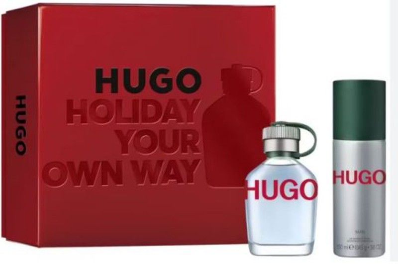Estuche Hugo ideal para regalar en temporada de fiestas. Incluye perfume en vaporizador de 75 ml y desodorante en spray de 150 ml. Diseño elegante con caja roja y detalles plateados y verdes. Perfecto para hombres que buscan un aroma fresco y moderno. Ideal como regalo de Navidad o cumpleaños.