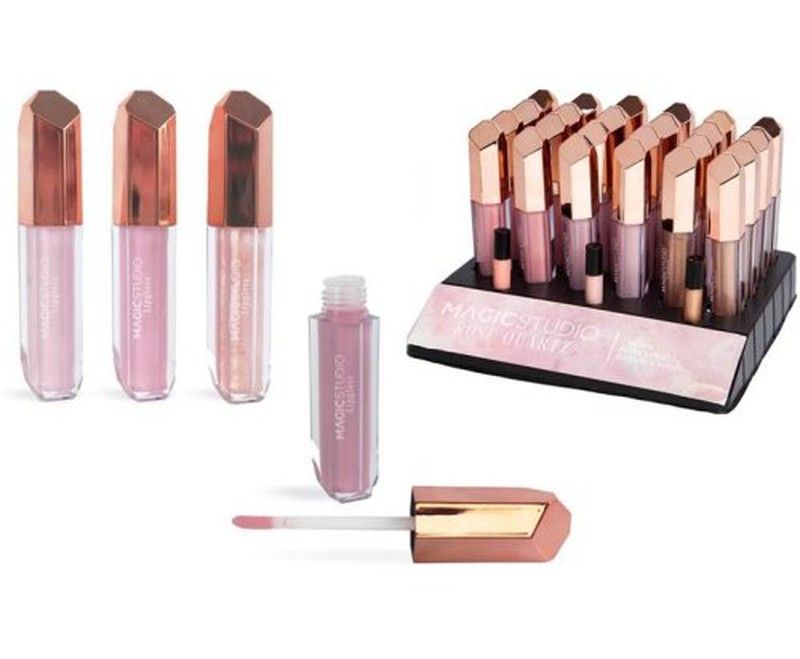 Lipgloss Idc Rose Quartz 50611: brillo labial con tono rosa suave y acabado luminoso. Ideal para un look natural y sofisticado. Con aplicador preciso para una aplicación uniforme. Perfecto para diario o eventos especiales. Presentado en elegante tubo con tapa dorada y diseño hexagonal.