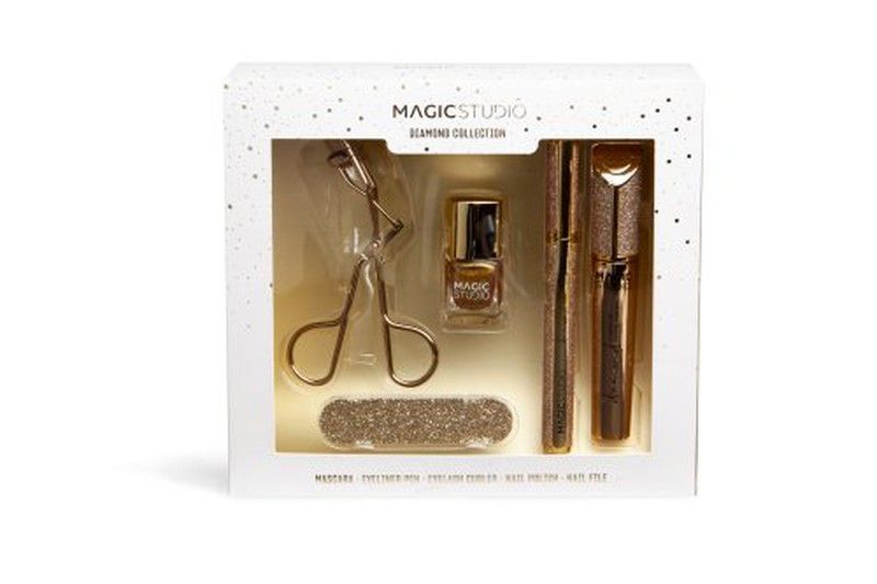 Set de belleza Magic Studio para el cuidado de pestañas y uñas, ideal para ocasiones especiales. Incluye pinza para pestañas, esmalte de uñas con brillo dorado, cepillo y esponja decorativa. Embalaje elegante y sofisticado, perfecto como regalo. Contenido visible a través de la ventana transparente de la caja.