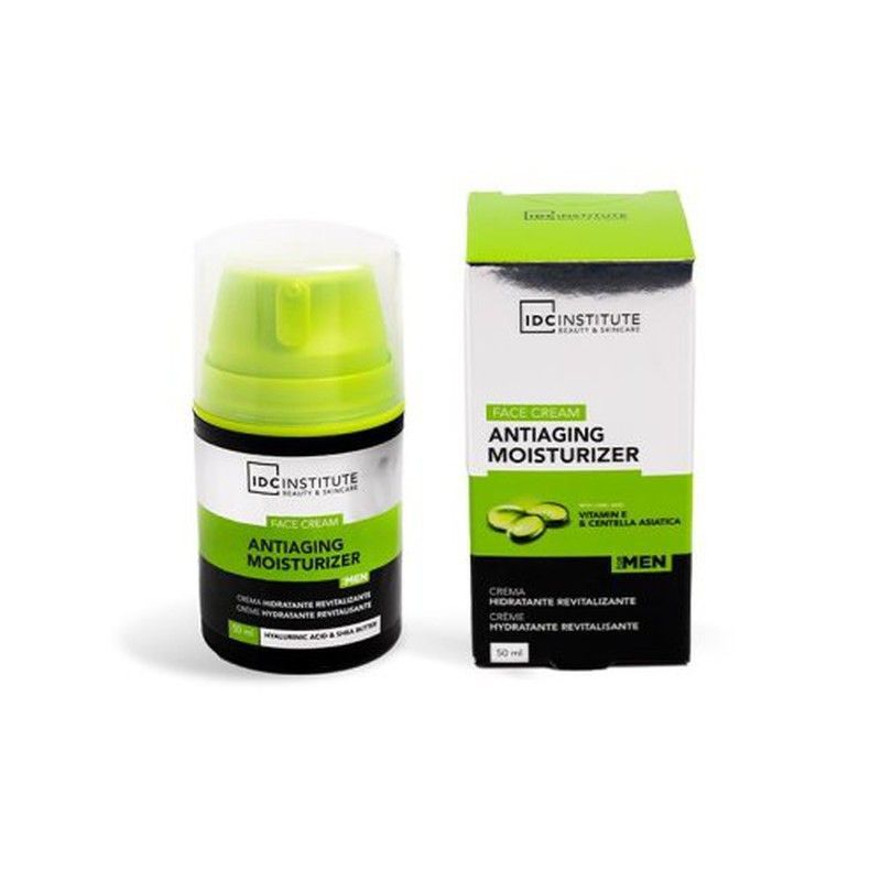 Crema antiedad para hombres de IDC Institute, en envase de 50 ml con tecnología de ácido hialurónico y centella asiática. Ideal para hidratar y revitalizar la piel, reduciendo las arrugas y mejorando la firmeza. Fórmula ligera y rápida absorción, perfecta para el cuidado diario de la piel masculina.