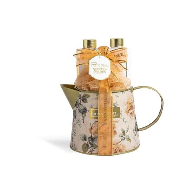 Set Garden Jarra Metal 3pzs 56213: una elegante jarra metálica con diseño floral en tonos pastel, ideal como regalo o decoración. Contiene tres frascos con tapas doradas, perfectos para perfumes, velas o productos de bienestar. Estilo vintage con cinta naranja y etiqueta decorativa. Ideal para amantes de la decoración floral y productos de cuidado